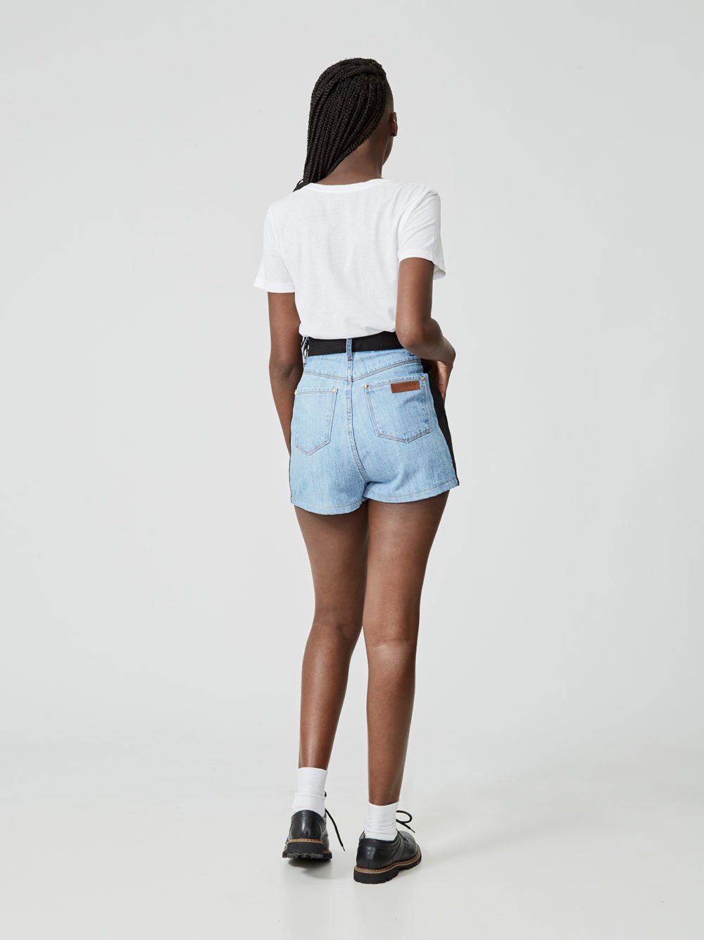 Shorts de cintura altíssima feito em jeans 100% algodão, modelagem inspirada em alfaiataria, super moderna com pregas na frente, e faixa lateral em sarja preta