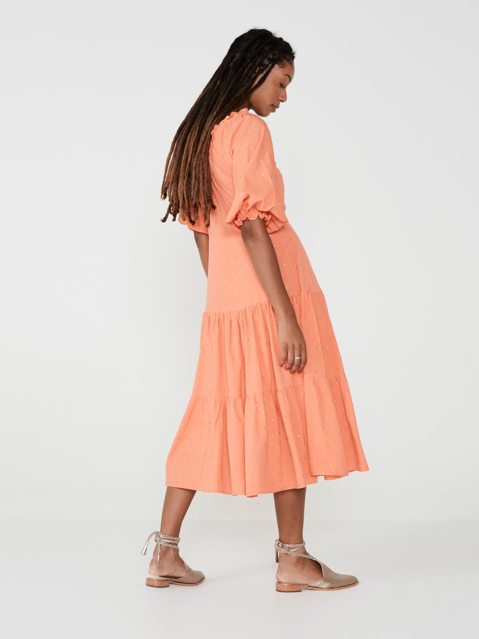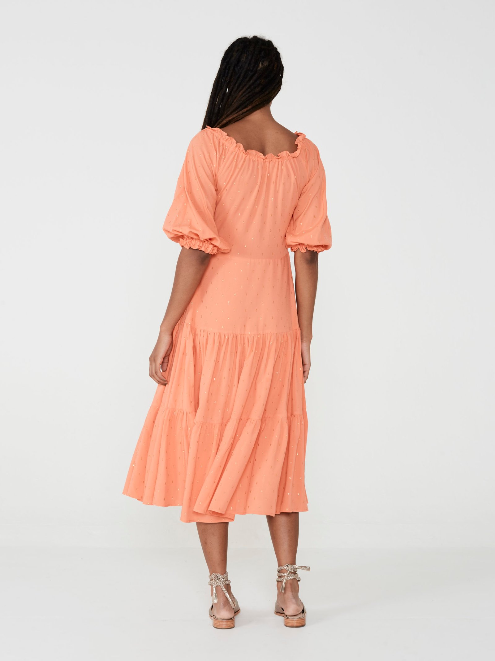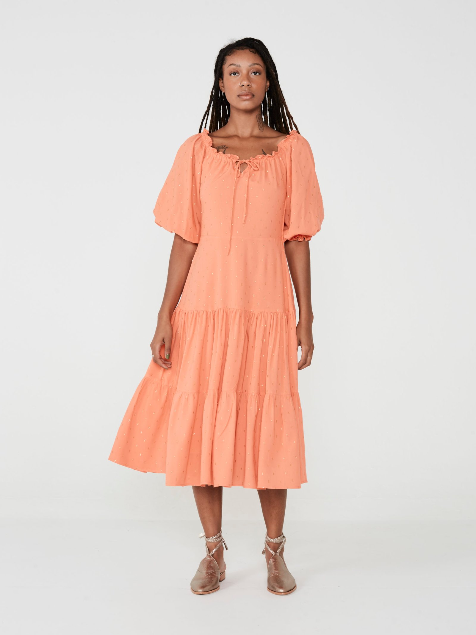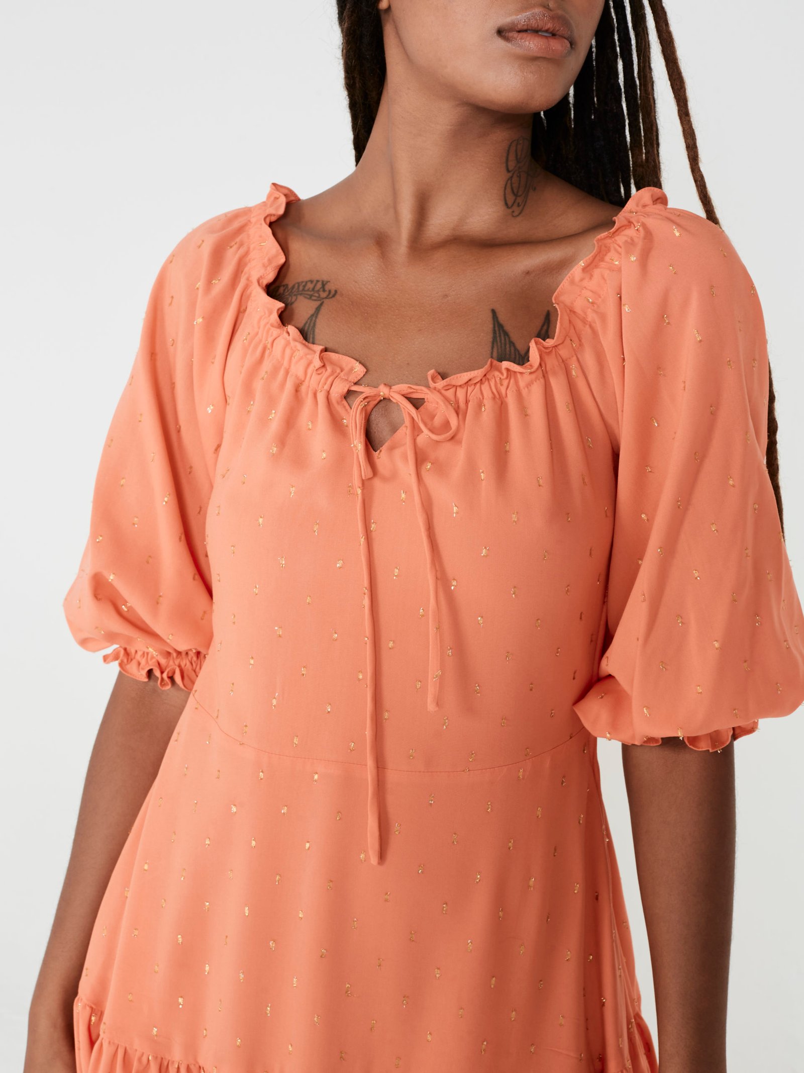 Vestido Boho super rodado, manga bufante, com detalhe de amarração no decote. Tecido com detalhes em lurex dourado, um charme a mais!!